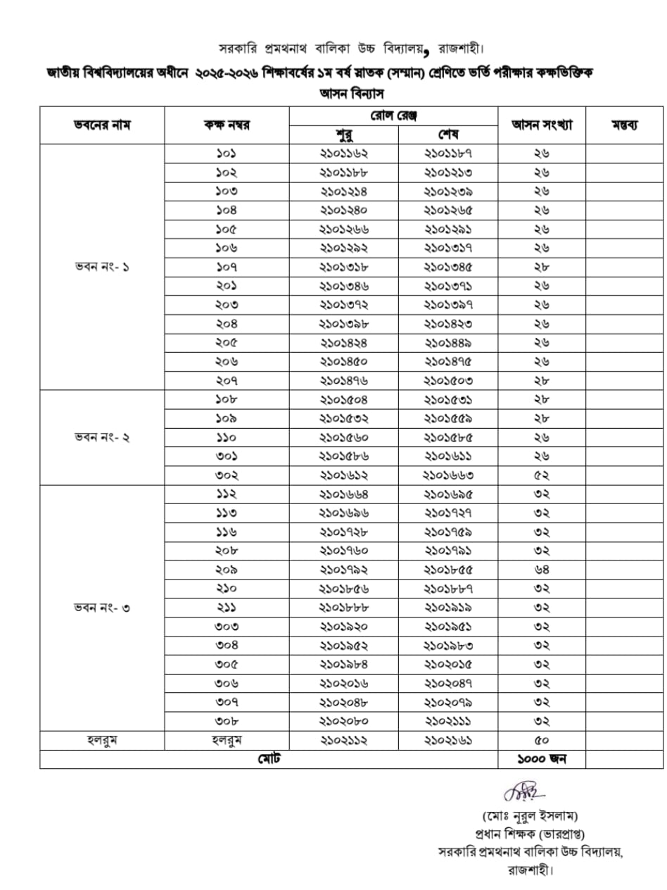 জাতীয় বিশ্ববিদ্যালয়ের অধীনে (রাজশাহী কলেজ) ২০২৫-২০২৬ শিক্ষাবর্ষের ১ম বর্ষ স্নাতক (সম্মান) শ্রেণিতে ভর্তি পরীক্ষার কক্ষভিত্তিক আসন বিন্যাস। পরীক্ষার তারিখঃ ২৫-০৪-২০২৬ খ্রি.